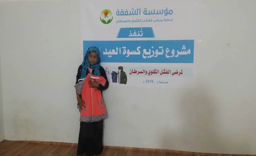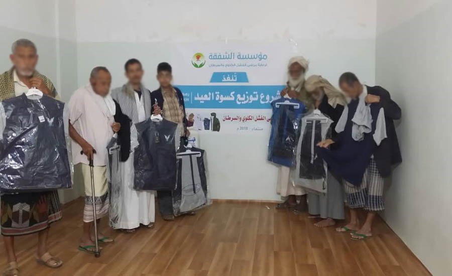 دشنت اليوم مؤسسة الشفقة بالعاصمة صنعاء مشروع توزيع الملابس العيدية لمرضى الفشل الكلوي والسرطان وأسرهم في الدار التابع للمؤسسة ، ولعدد ١٩٦ مريض ومريضة مع مرافقيهم ٦٨ رجال و ٥٢ مرافق و ٥٢ نساء و ٢٥ مرافقه.